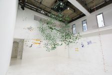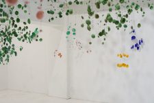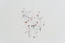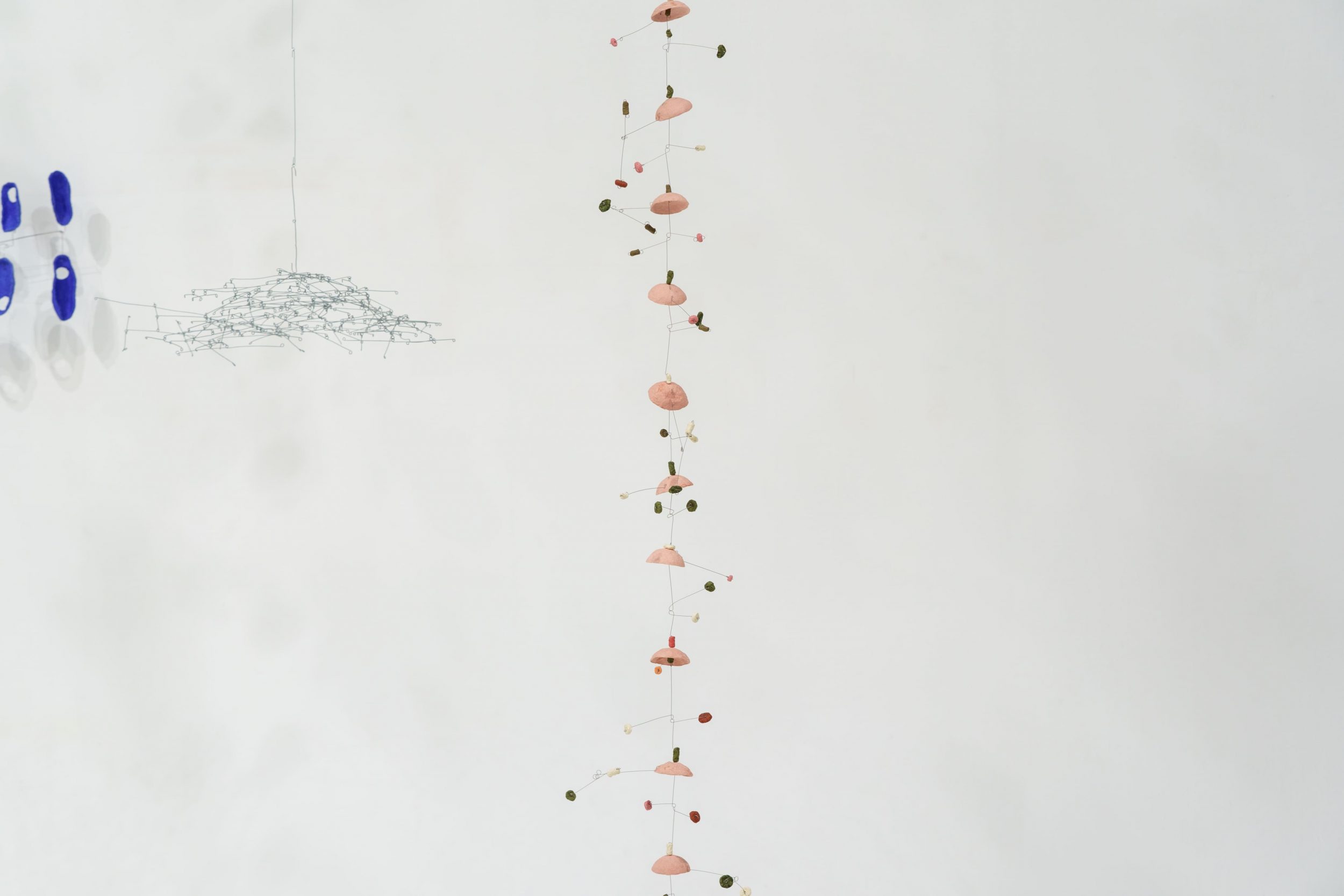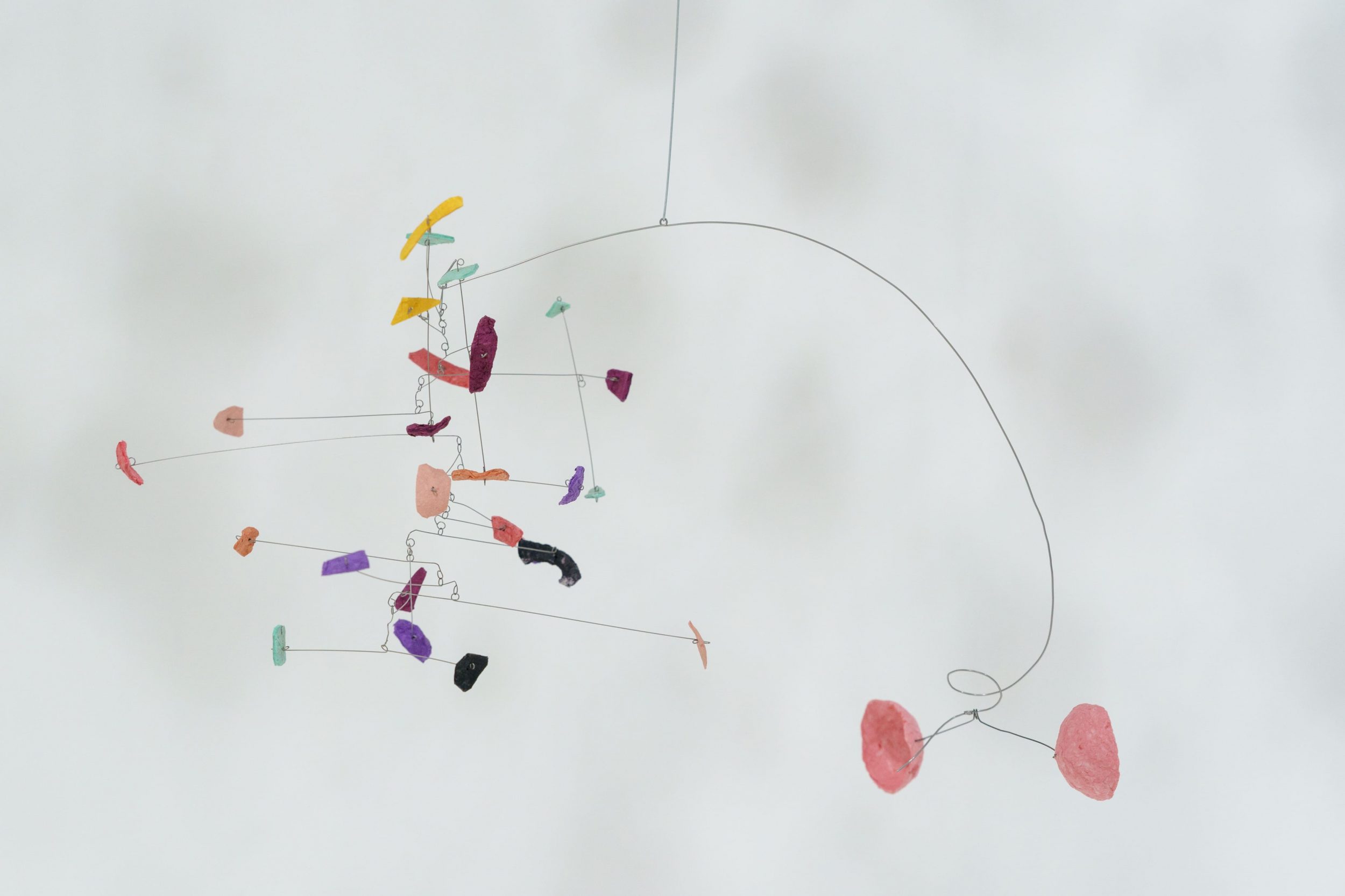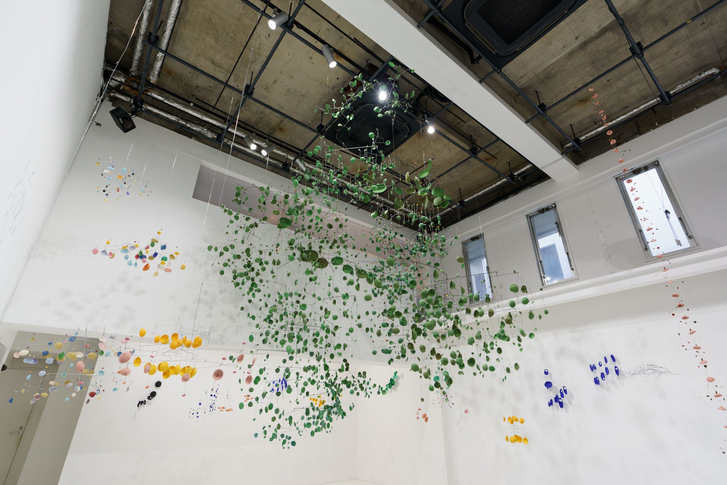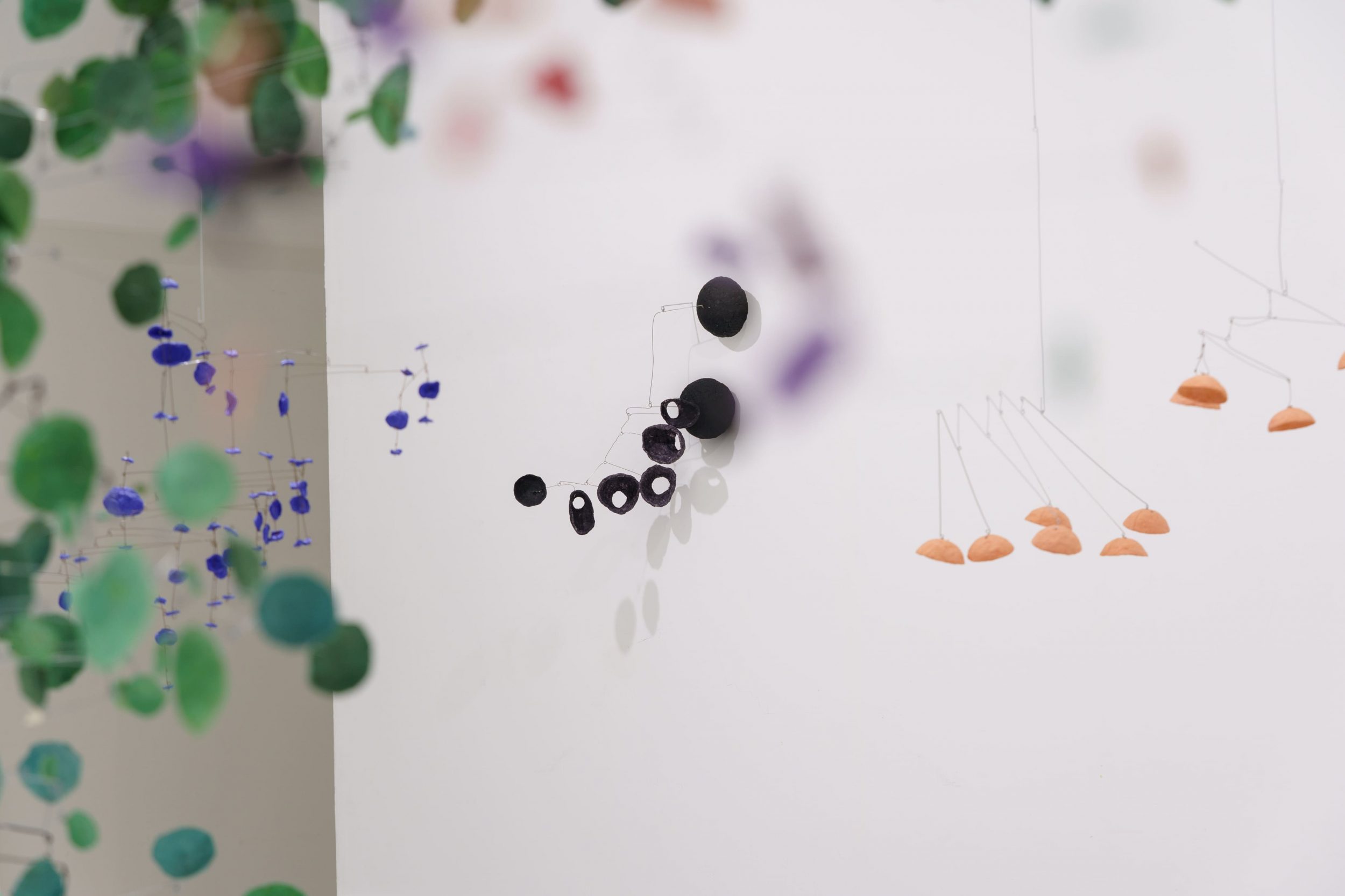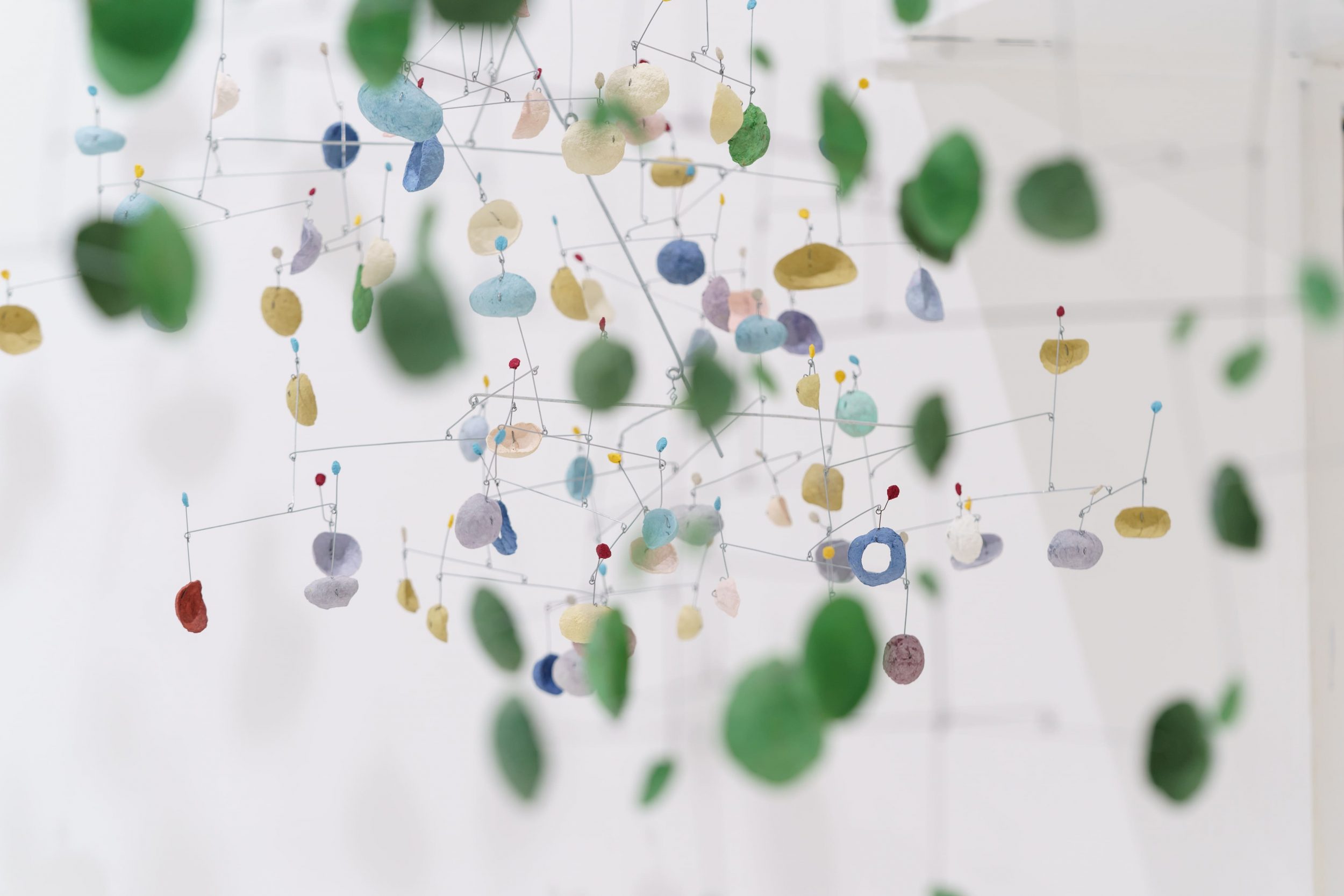 新作「モシモシカルタ」は、日本のいろはかるたに着目し、最初の一文字48文字に呼応する形で制作されました。いろはかるたの文法や音節、自由な言葉の連想を繋げる言葉遊びのように、壁や天井から吊るされたモビール作品が空間内を軽やかに彩ります。ぜひこの機会に、CALM & PUNK GALLERYでご高覧ください。